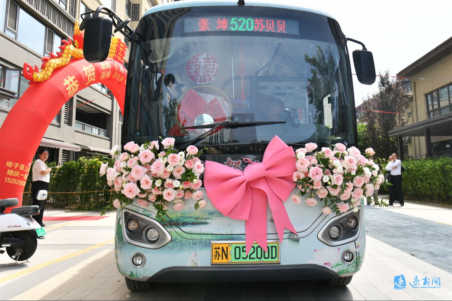 5月4日,宿城區(qū)雙莊街道白堡社區(qū)新城璽樾府小區(qū)內(nèi),兩輛裝扮一新的“酒都小巴”成為亮眼的風(fēng)景:車頭“520”的標(biāo)識格外醒目,車窗上大紅“喜”字熠熠生輝,車廂內(nèi)紅色裝飾交相輝映,處處洋溢著喜慶的氛圍。