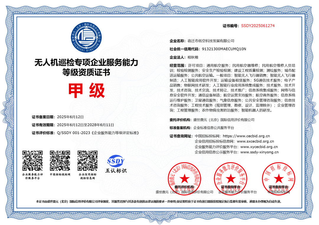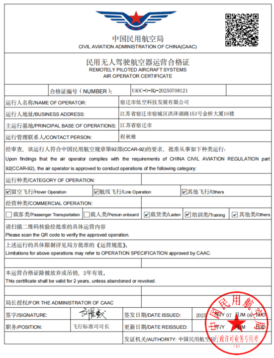 近日,低空科技公司憑借國企的責(zé)任擔(dān)當(dāng)、高效的團(tuán)隊(duì)執(zhí)行力和對(duì)低空經(jīng)濟(jì)發(fā)展趨勢的敏銳洞察,成功斬獲“民用無人駕駛航空器運(yùn)營合格證”及低空領(lǐng)域核心資質(zhì)13項(xiàng),為公司在萬億級(jí)新藍(lán)海中揚(yáng)帆起航奠定堅(jiān)實(shí)基礎(chǔ),也為宿遷低空經(jīng)濟(jì)產(chǎn)業(yè)高質(zhì)量發(fā)展注入強(qiáng)勁動(dòng)能。