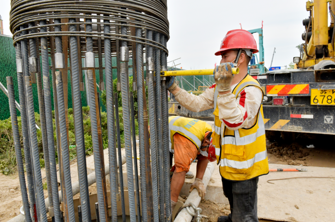工人在安裝鋼筋籠